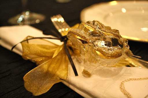 | For an easy, yet festive party favor, use ornaments as napkin holders. When the night is over, each guest can take one home! |