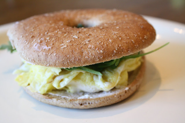 2. Bring a medium skillet to medium-high heat and spray with cooking spray. Scramble the eggs and spoon them onto one side of the bagel thin. Salt and pepper the eggs and top them with a small handful of arugula. Lightly press the sandwich together.