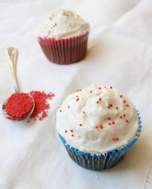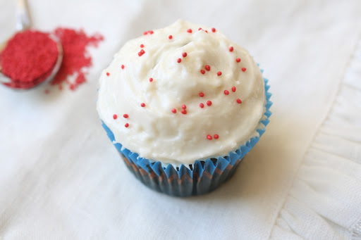 4. For the frosting: In the bowl of an electric mixer equipped with a paddle attachment, beat the butter, cream cheese, and vanilla extract until fluffy. On low speed, gradually add the sifted sugar to the mixture and beat until fully combined. Frost the cupcakes and top with sprinkles, if desired.