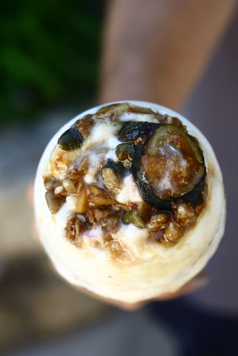 This recipe allows you to use whatever you have on hand, mixing and matching flavors, with no fancy equipment required. Layer granola, mixed nuts, and ripe fruit with dollops of yogurt in a glass vessel, pop the glass in the freezer for a few hours, and enjoy a specially-designed, portable snack.