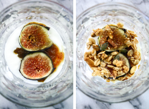 Drizzle the sides of the glass with honey. Cover the bottom with a dab of yogurt. Layer bits of jam, figs and granola with the yogurt, sealing the top with yogurt. Stick a spoon through the center of the “parfait,” and freeze for at least five hours. To release the popsicle, run the glass under warm water and twist the spoon.