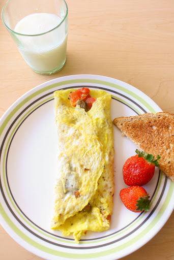 The second recipe–mixed veggie and goat cheese omelette–was inspired by an exquisite mushroom and spinach omelette I had at French Blue in St. Helena, CA. The omelette’s exterior was just set, encasing the veggies like a blanket, while the egg inside remained silky and almost molten. While my homemade version does not match the buttery goodness of French Blue’s, it received a seal of approval from my roommate, who declared that if all else fails, I could become a chef. 🙂