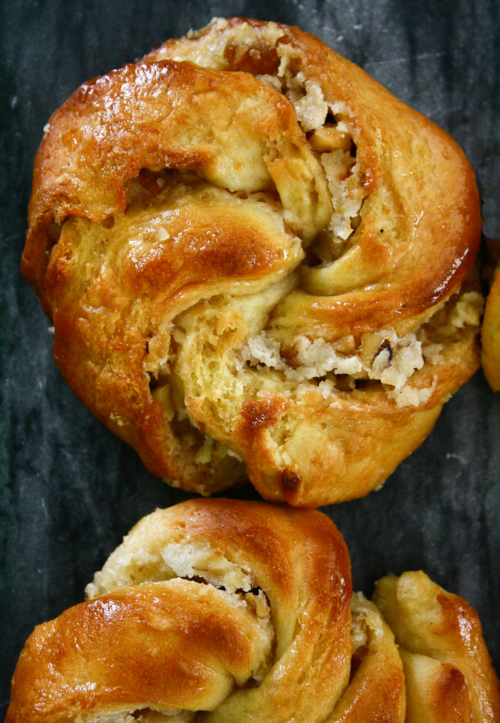 For these orange-walnut twists, I worked with a yeasted pastry dough for the first time. Though the process was a bit labor intensive, I was thrilled with the flavor and gorgeous, golden appearance of the final product. I followed the recipe exactly, but added chopped golden raisins to the filling for an extra burst of sweetness. I recommend eating these twists on the day-of, ideally while they’re still warm out of the oven.