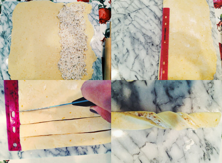 4. Roll out the rested dough into a 22 x 12 inch rectangle on a lightly floured working surface. Spread the nut filling evenly on the 22-inch side. Fold the uncovered side over the side with the filling. Cut the dough into 1-inch strips (crosswise). Twist each strip 4 or 5 times. Hold one end of the twist onto a greased, unlined baking sheet, then curl the remaining strip around the center to form a pinwheel. (See above for step-by-step photos).