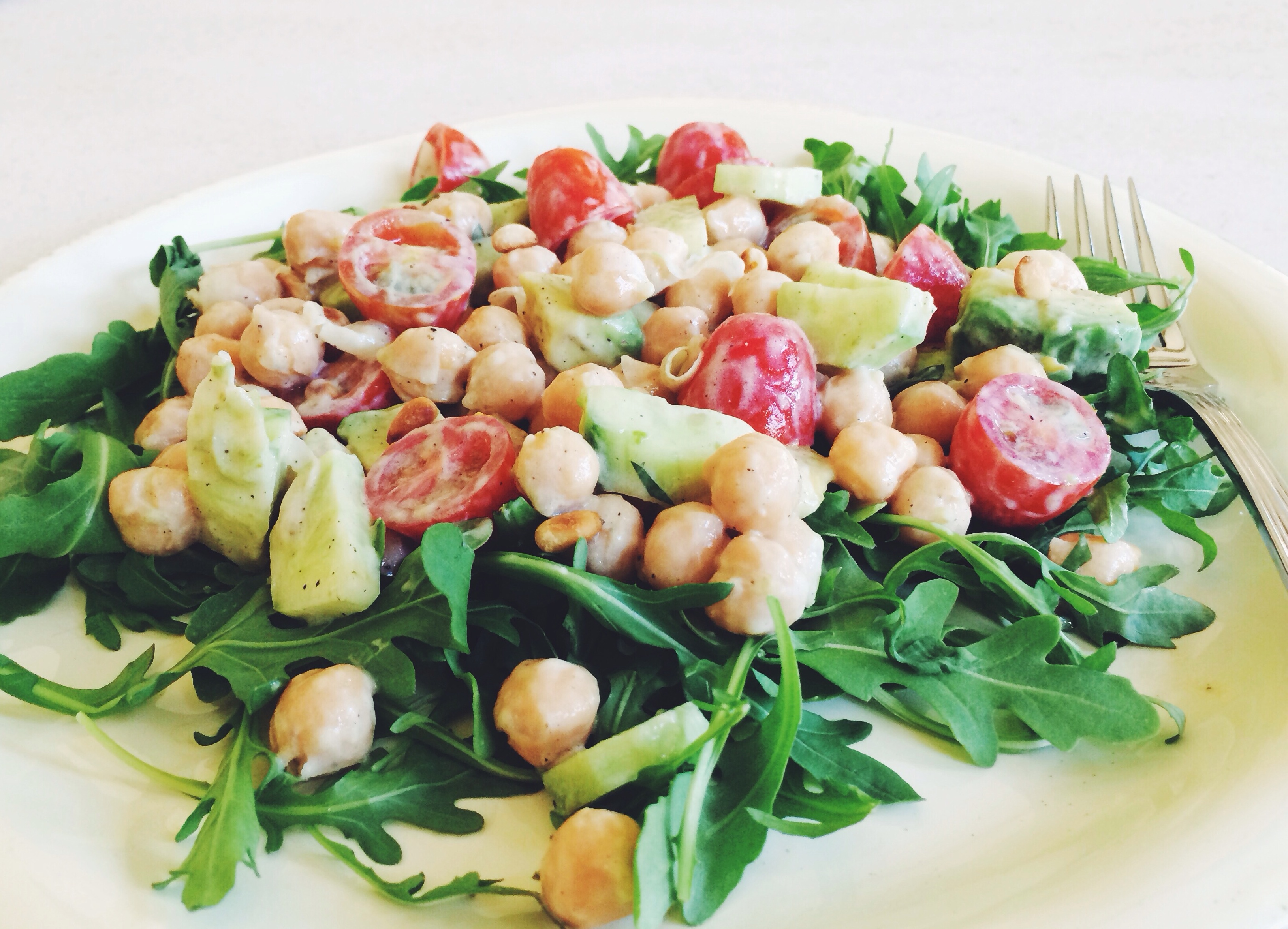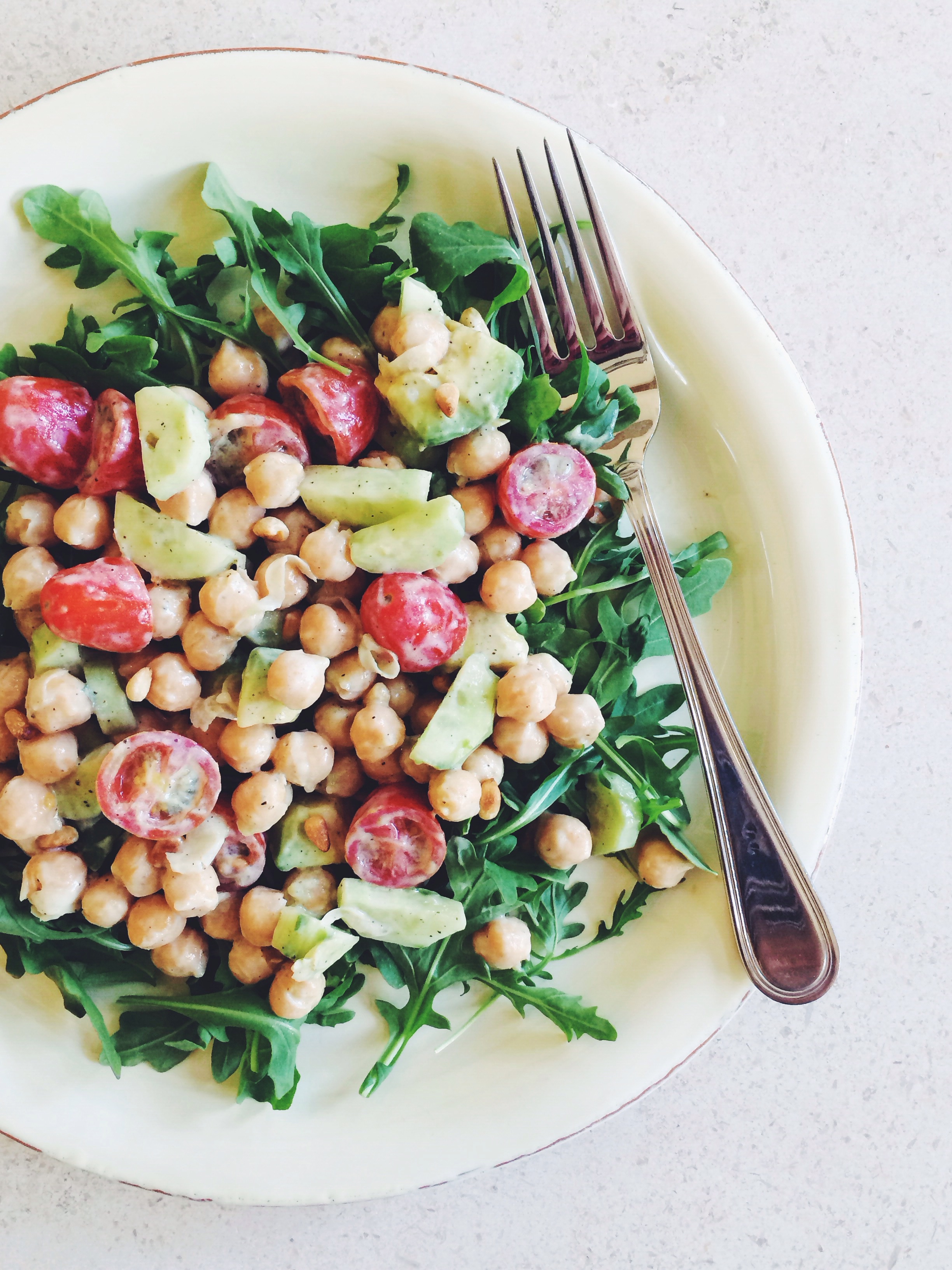 2. To plate, place one cup of arugula on each plate. Top with chickpea salad.