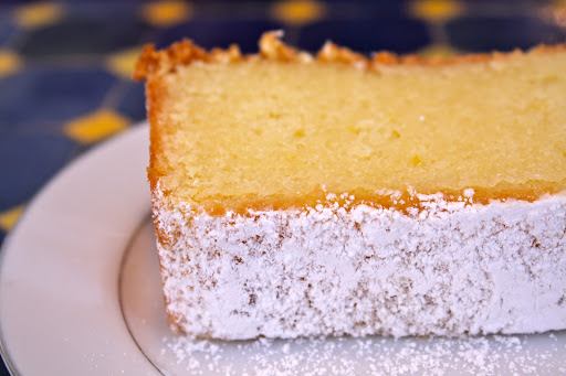 The 7 Up pound cake is moist and tender, dusted with a thin layer of powdered sugar.