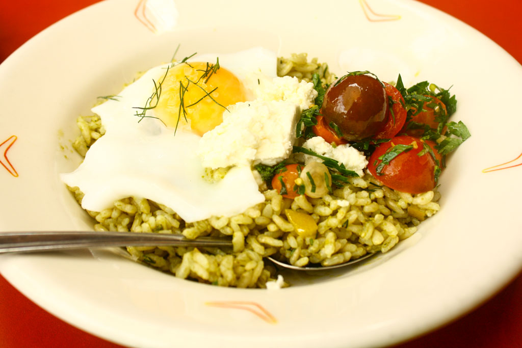 Brown rice bowl with sorrel pesto, poached egg, and crumbled feta.